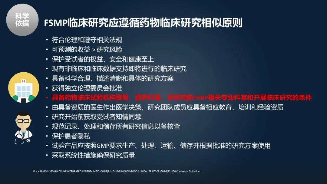 特殊性用途配方食品,基本上是遵循像药物临床研究的一些的原则。其中最重要的,是这个临床研究机构必须具备临床试验的资质,包括医院、研究机构,它有能力开展临床研究。在这样的条件,你才可以做特医食品的临床研究。